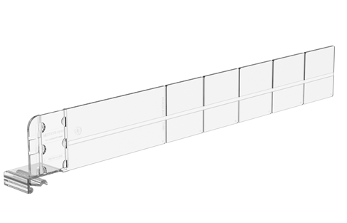 Similar to our sliding dividers, the new dividers can be easily snapped off at the predetermined breaking points. This allows them to be flexibly adapted to different depths and ensures a clear structure on the shelf. The height of the flexible shelf dividers has been adjusted to the standard system height of 55 and provided with a groove so that they can be perfectly combined with our sliding dividers. In addition, the label holder for shelf dividers can be attached to the front of the shelf divider in three different positions.